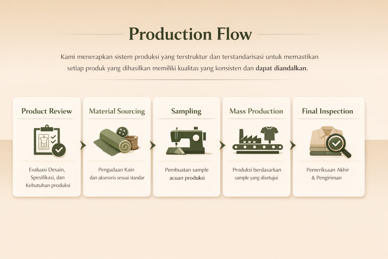 Brand Production adalah layanan produksi menyeluruh di mana kami menangani proses dari pengadaan material hingga barang siap dikirim ke tujuan sesuai kesepakatan.